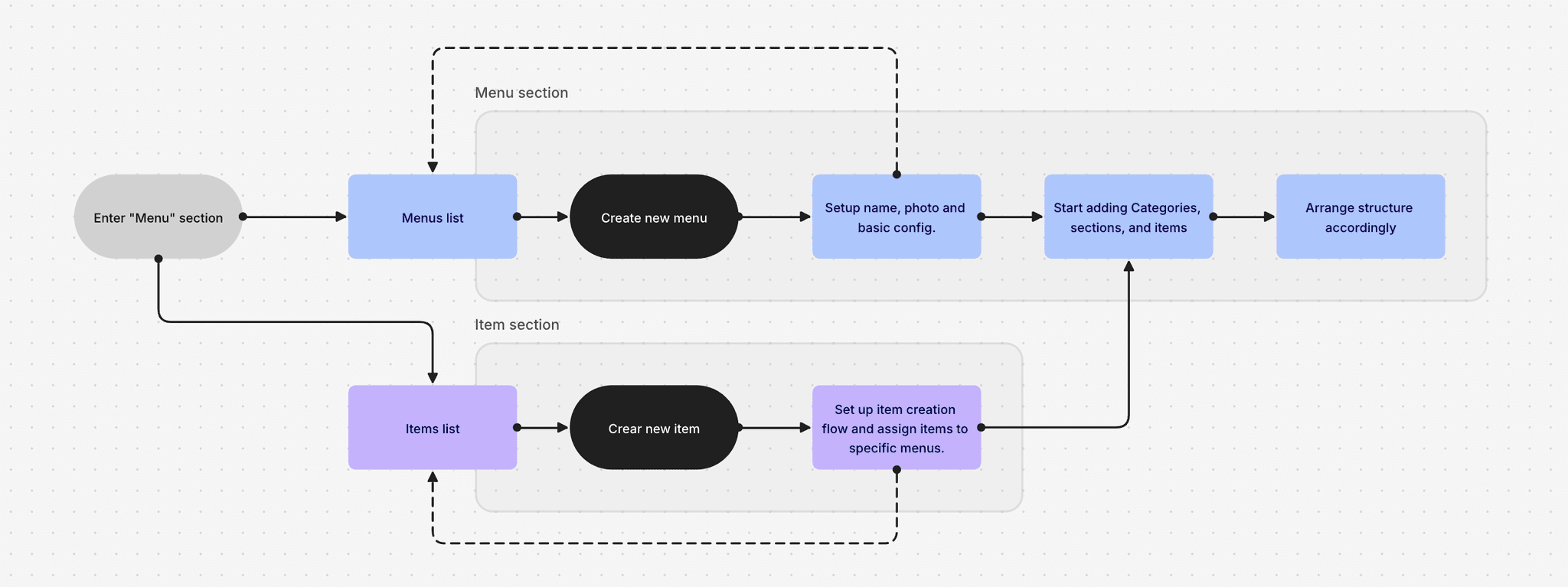 The solution: A step-by-step user flow that separates menu details setup from the arrangement phase, where categories, sections, and items are created and organized.
