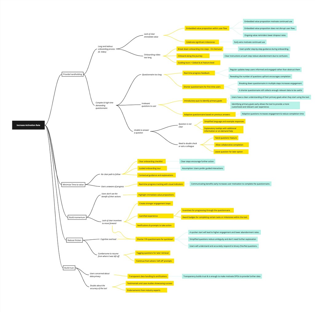 I led an ideation session with the entire team to address the main challenges. I proposed using the Opportunity Solution Tree framework to trace ideas back to the identified opportunities and desired outcomes, allowing us to evaluate and prioritize based on potential impact.