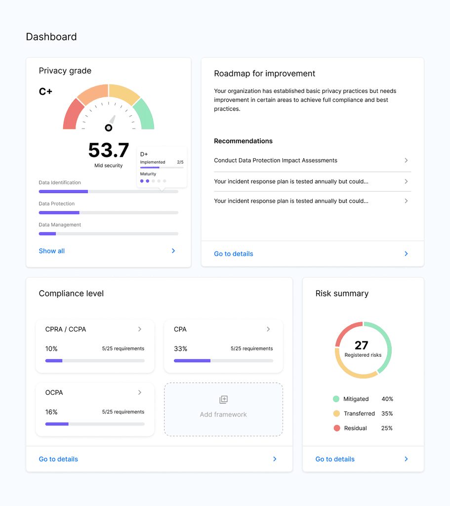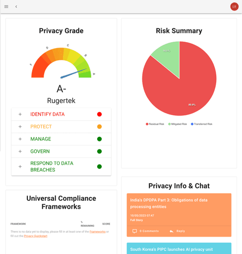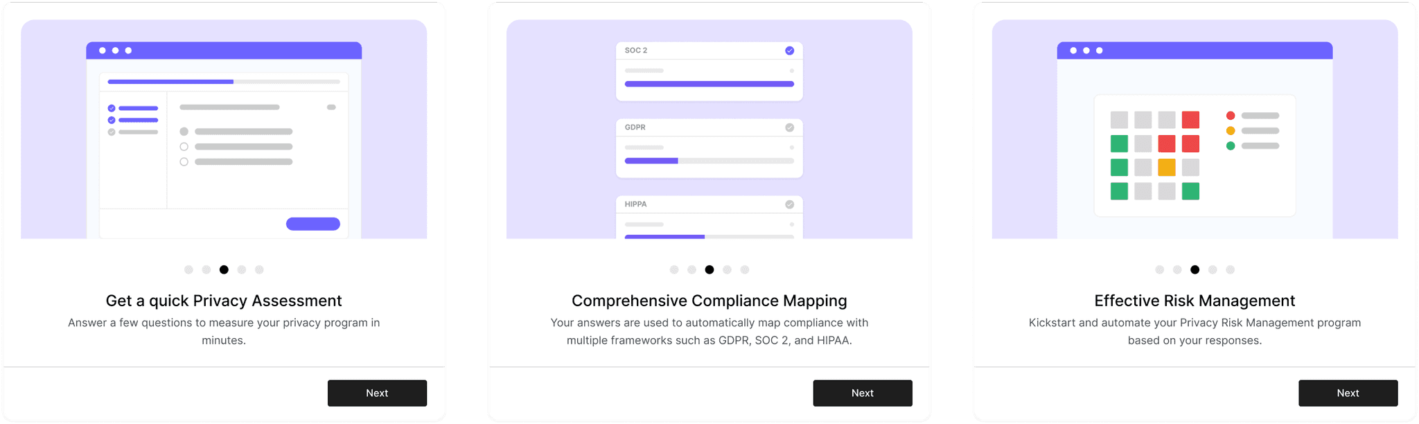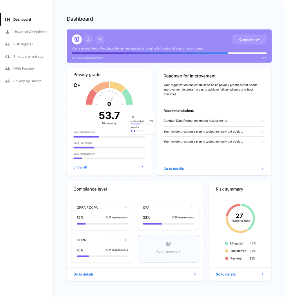 After completing the Quickstart Yes/No questionnaire, users received a celebratory message and were directed to the dashboard, where they expected to see the promised value: an assessment of their privacy program.