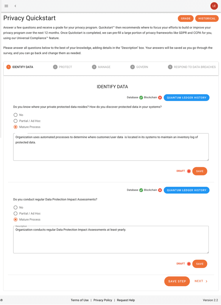 B) Completed Quickstart Privacy Questionnaire > Prompt to assess maturity level