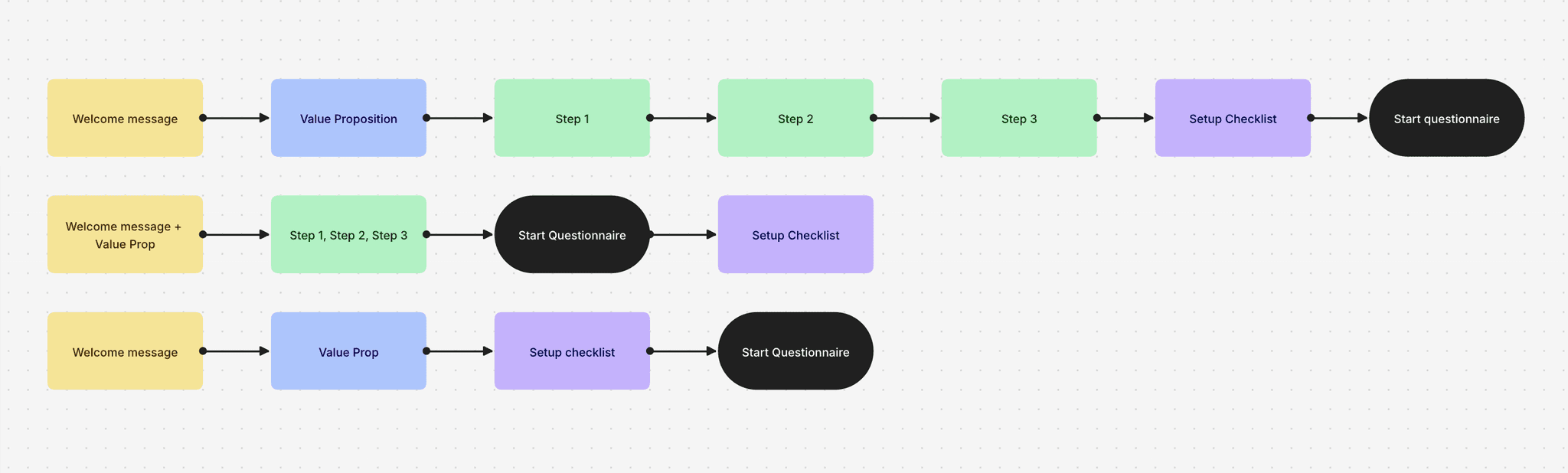 To set expectations for the next steps, I designed a setup checklist and tested various user flow alternatives to identify the clearest option that leads to higher conversion rates for starting the questionnaire. The goal: determine the most effective onboarding flow to maximize conversion rates for starting the questionnaire by evaluating clarity, ease of navigation, and user engagement.