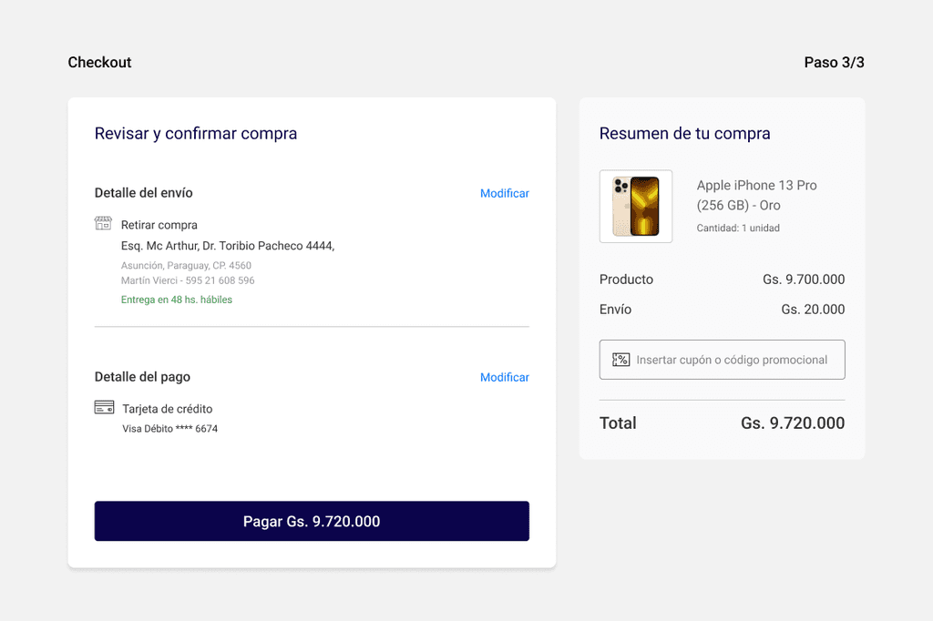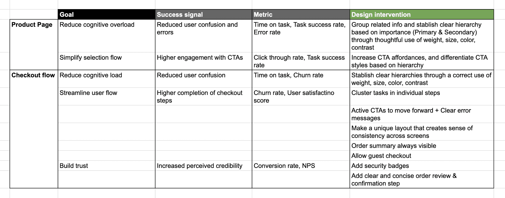 For the checkout, we focused on streamlining the flow by A/B testing specific variants to validate hypotheses: single-page vs. multi-step checkout, placement and presence of security badges, size and copy of the main CTA, and guest checkout vs. account creation.