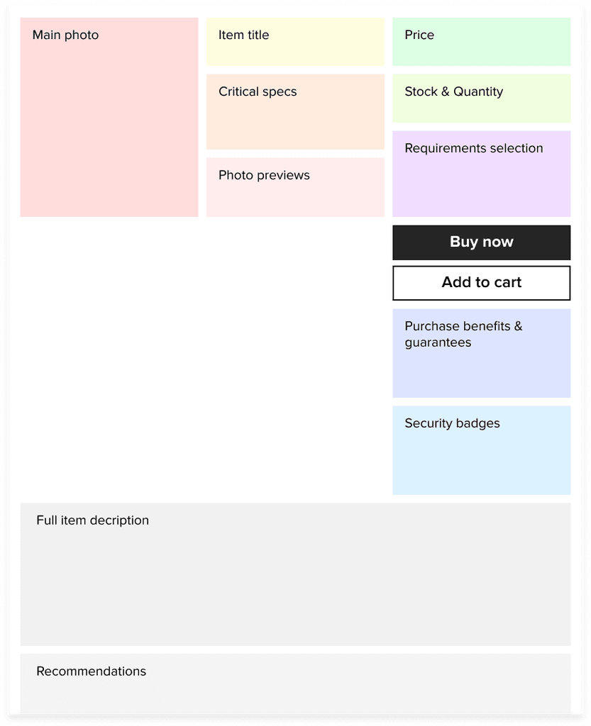 Finding the best performing layout. For the product page, I suggested testing multiple combinations to identify the highest converting alternative. To facilitate this, I created a multivariable sheet with variations in information clustering and order, primary and secondary information placement, hierarchies, position of price, and CTAs.